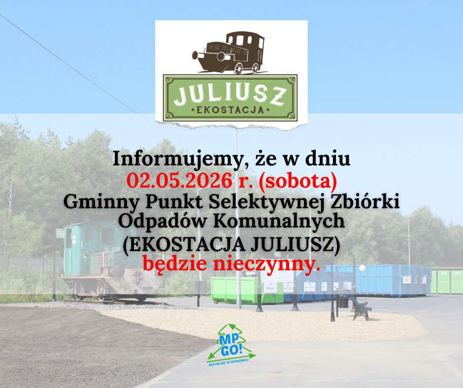 Informujemy, że w dniu 02.05.2026 r. (Sobota) Gminny Punkt Selektywnej Zbiórki Odpadów Komunalnych – Ekostacja Juliusz będzie nieczynny.